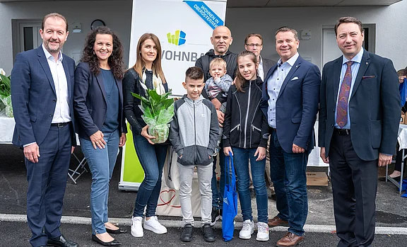Am Bild: OÖ Wohnbau Geschäftsführer Mag. Bernhard Baier mit LAbg. Mag. Helena Kirchmayr und neuer Bewohner-Familie, Bürgermeister Christian Partoll und LH-Stv. Dr. Manfred Haimbuchner